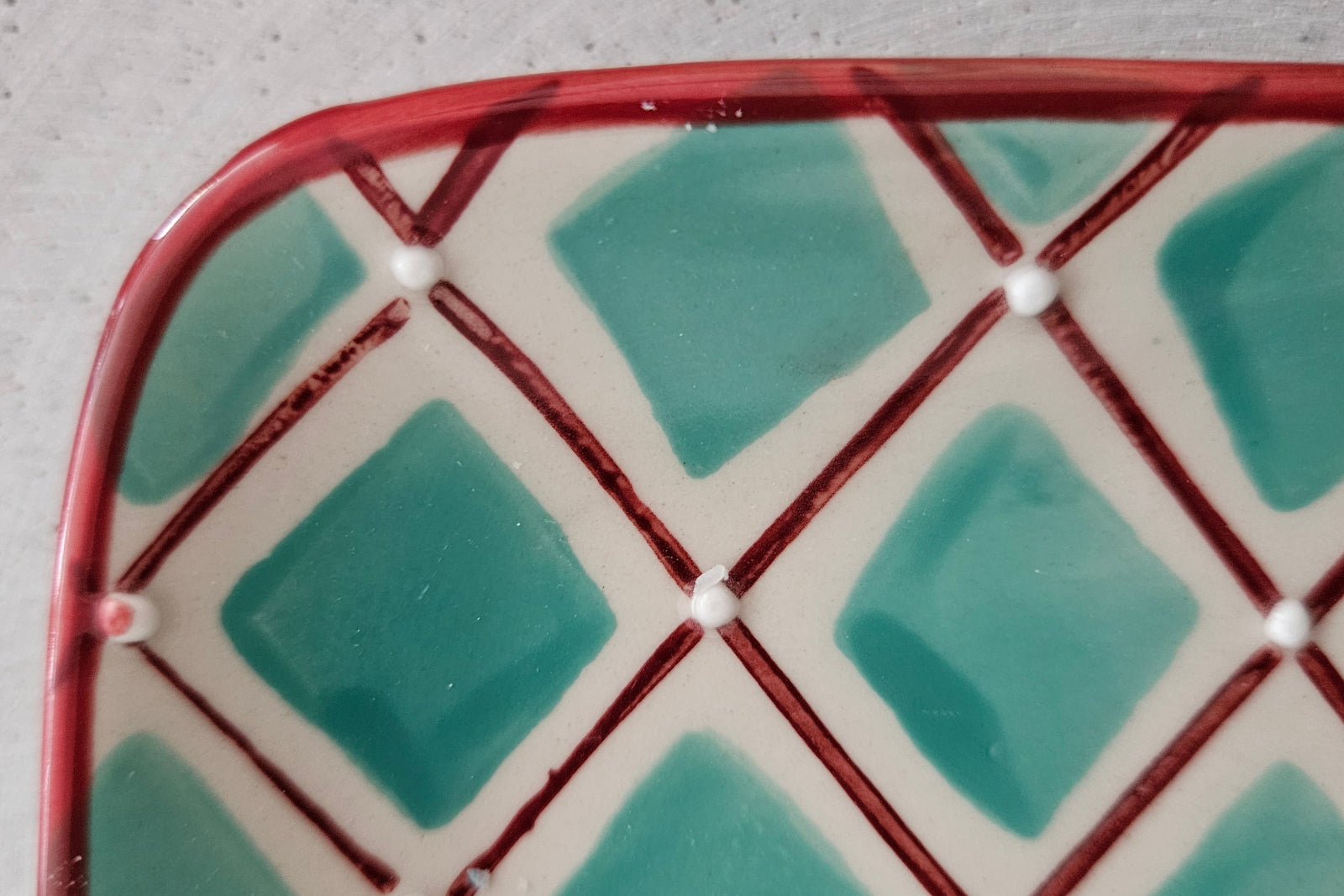 Die klassisch eckige Form und das farbenfrohe Muster sind ein echter Hingucker in deinem Badezimmer. Die Farben und Muster sind von Hand aufgebracht und machen jede Schale zum Unikat. Drei Löcher sorgen für ein gutes abtropfen deiner Seifen. Ohne Seife!