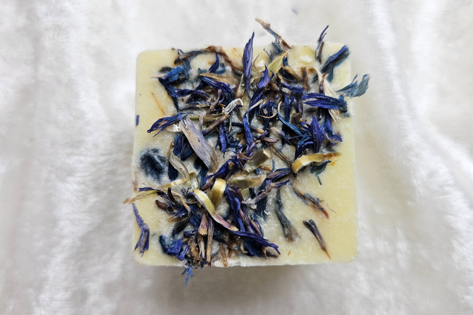 INCI: Sodium Bicarbonate, Theobroma Cacao Seed Butter, Zea Mays Starch, Citric Acid, Butyrospermum Parkii Butter, Parfum, Centaurea Cyanus Flower, Sheep Milk, Olea Europaea Fruit Oil, Turpentine, Hexyl Cinnamal, Dimethyl Phenethyl Acetate, Pinene, Citronellol, Geraniol, CI 77007,CI47005, CI77002.