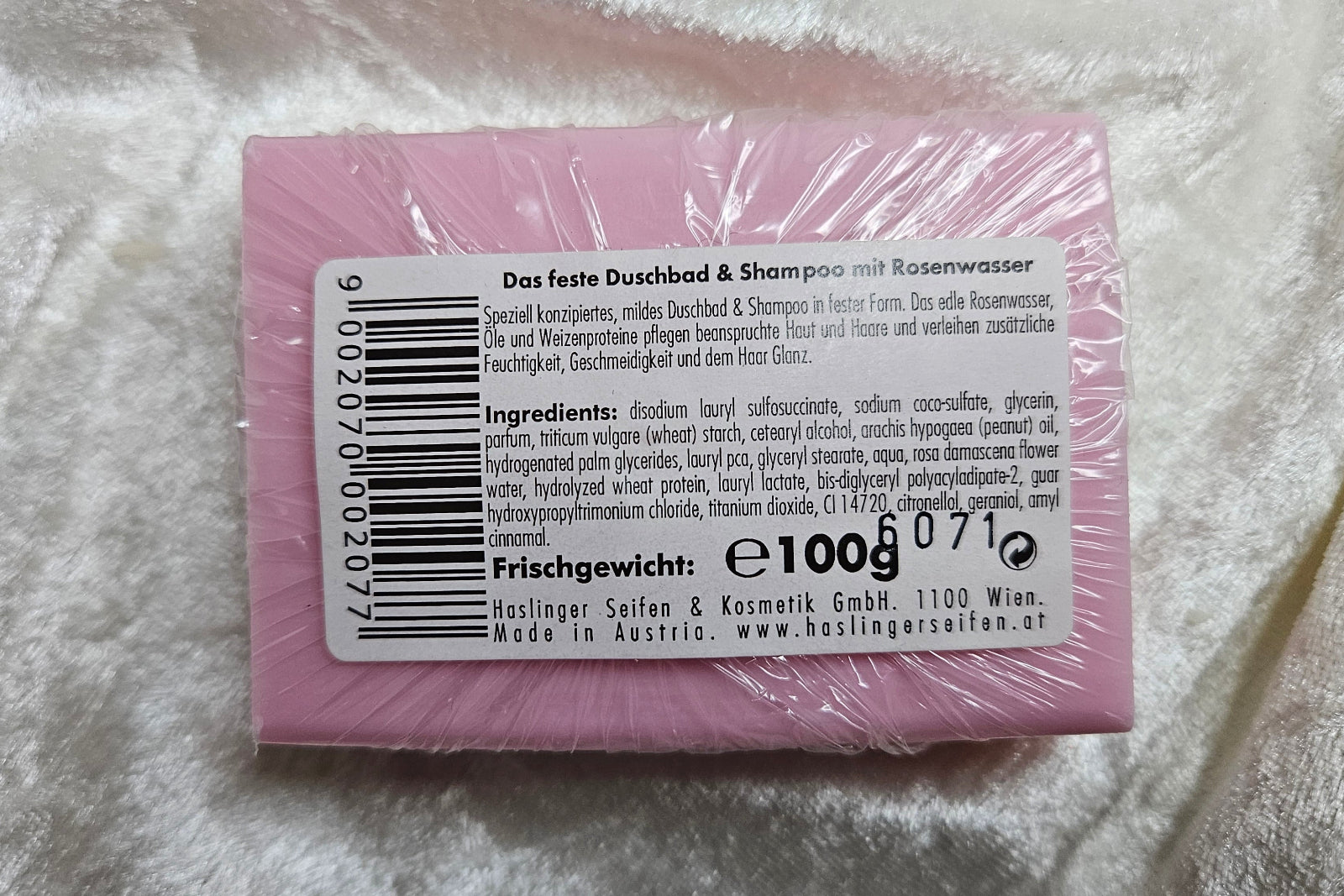 Die Haarseife der Firma Haslinger eignet sich für alle die eine unkomplizierte Alternative zu herkömmlichen Shampoo oder Duschgels suchen. Haare wie gewohnt waschen und ausspülen, keine saure Rinse nötig da der Wasserenthärter enthalten ist. Super ergiebig, zarter Rosenduft, Frischgewicht 100 gr